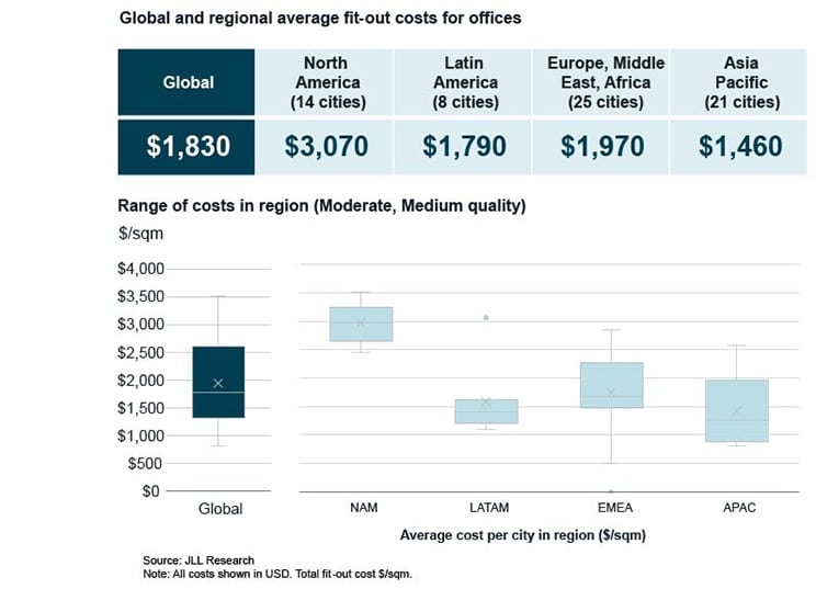 As corporations worldwide continue to adjust their hybrid policies to favor in-office attendance, the office sector has regained a central role in commercial real estate. While companies are optimistic about growth – planning increases to headcount and seeking more or improved office space – economic and geopolitical uncertainties persist. To help guide corporations through this next phase, JLL (NYSE: JLL) today released its Global Office Fit-Out Cost Guide 2025, providing insights into the average costs for office fit outs. By analyzing data from 68 cities in 40 countries around the globe, the Global Office Fit-Out Cost Guide uncovers key findings across global cost variations, cost drivers, sustainable fit out demand and market sentiment.