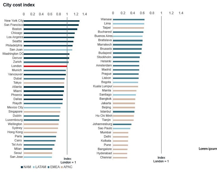 Global variations between major cities also persist. U.S. cities dominate the top 20 cities by office fit-out cost globally, alongside other major cities such as Vancouver, Tokyo, London and Dubai. Alternatively, global cities with high growth across India, South Africa, Vietnam and China offer among the lowest fit-out costs globally, though they are actively experiencing high construction growth and an evolving cost landscape.