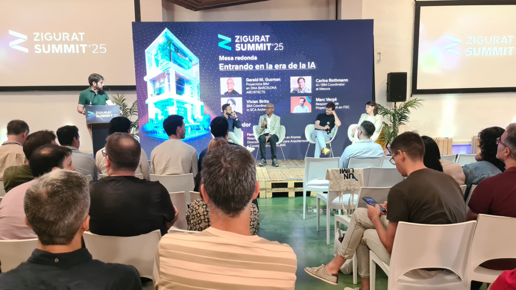 The day included two roundtable discussions, which sparked intense dialogue between speakers and audience. The first panel featured Vivian Sirito, BIM Coordinator at GCA Architects; Carlos Rothmann, AI/BIM Coordinator at Mesura; Gerald M. Guzmán, BIM Designer at DNA Barcelona Architects; and Marc Vergé, Head of AI Projects at ITEC. The second featured Vicki Reynolds, Lilian Ho and Chris Dymond, moderated by ZIGURAT professor and Director of the International Master em Gestão de Projetos na Construção Bruno Mota.